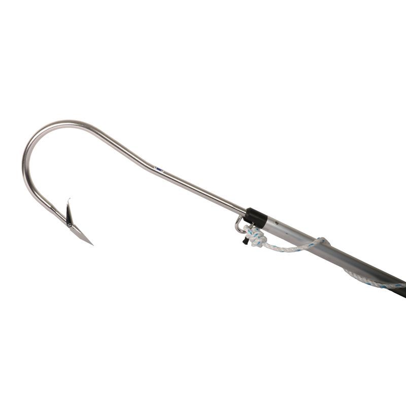 Le déclenchement par quart de tour du clip de sécurité du manche permet de libérer la gaffe solidement ancrée dans la chair du poisson grâce à son ardillon rétractable, permettant ainsi de ramener le poisson au bateau avec la corde de 6m.