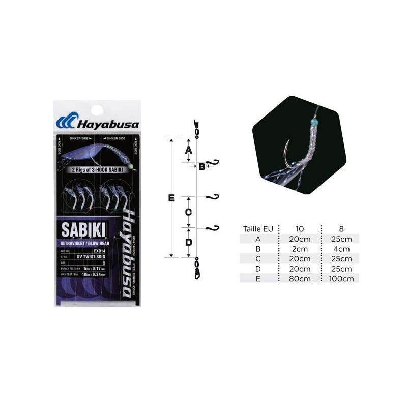 Le corps et la queue de ces mouches type « UV Twist skin » (peau roulée) sont conçus en peau de poisson traitée UV, une longueur d'onde visible par les poissons.