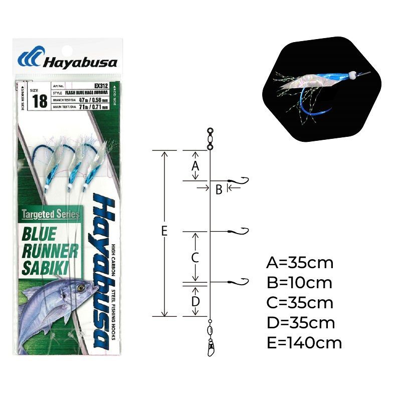 Le Sabiki Hayabusa EX312 est un montage prémonté robuste, spécialement conçu pour cibler le blue runner, un carangidé combatif très présent dans l'Atlantique (est et ouest) ainsi qu'en Méditerranée.