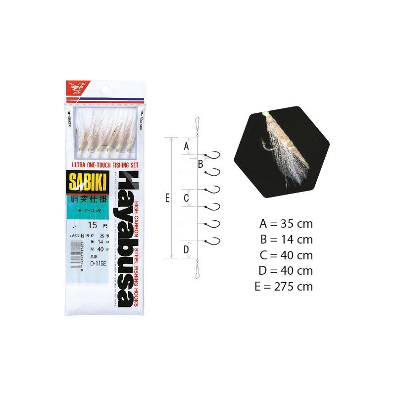 Le sabiki D115E HAYABUSA, est équipé de 6 hameçons de couleur dorés référence H.MRS taille 15