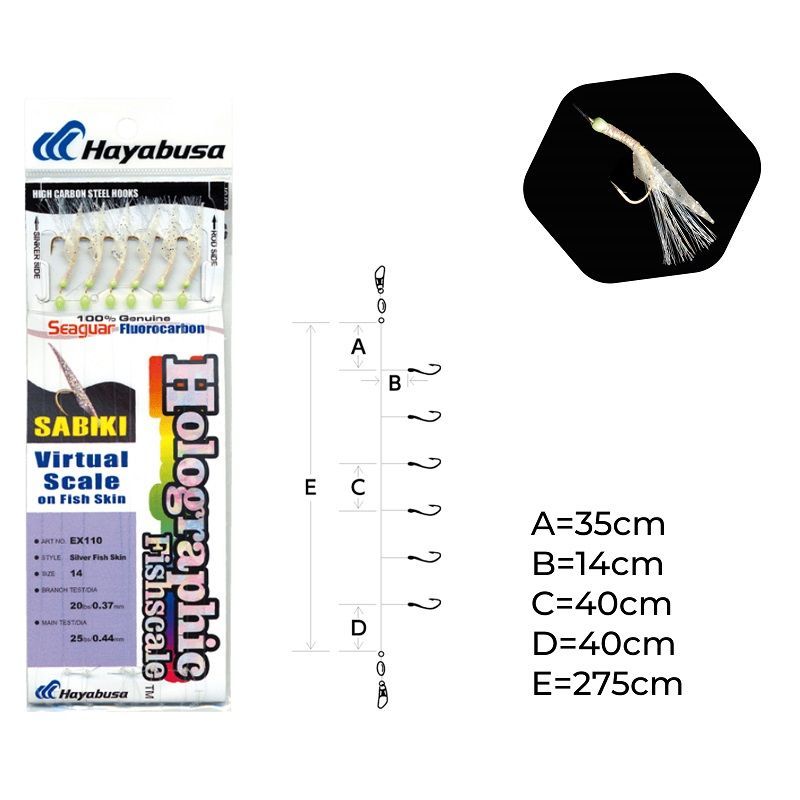 Le Sabiki EX110 Hayabusa est un montage polyvalent, efficace sur une grande variété d'espèces à travers le monde. Conçu avec la technologie exclusive Virtual Fish Scale, il reproduit l'éclat naturel des écailles de poisson pour une attractivité maximale.