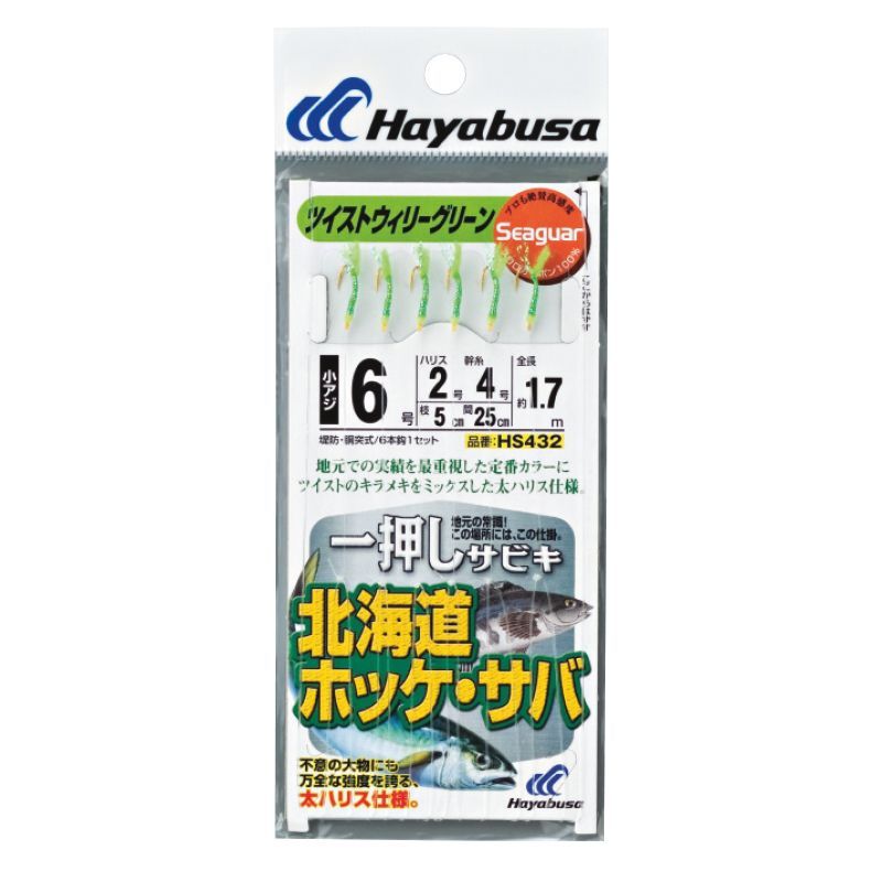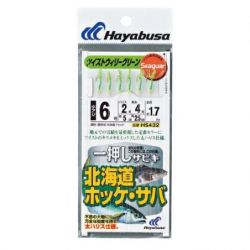 Le Sabiki HS432 HAYABUSA est un bas de ligne avec des mouches de type larve.Le corps est en peau roulée phospho et la queue en fibres vertes phophos avec des brins de tinsel holographiques plats torsadés.